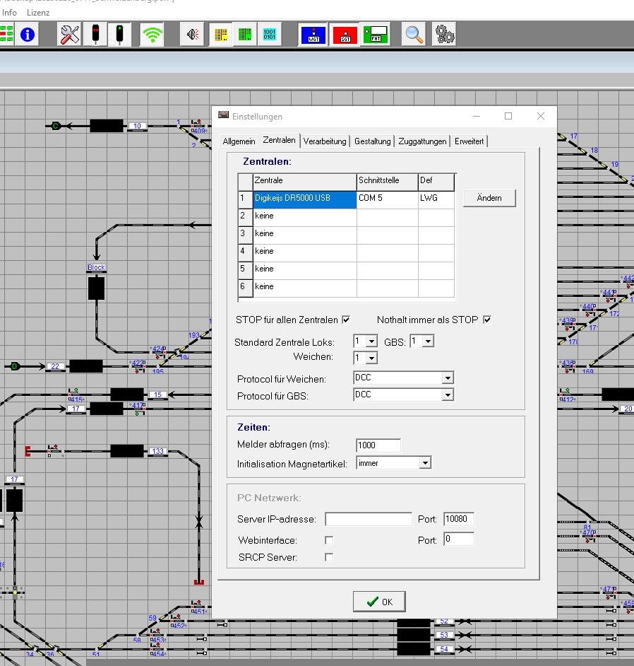 Die Einstellung für die Zentrale bitte mal im Gerätemanager im Win überprüfen ( Bild 2 ) , sollte dann Lnet com sein. diese dann in Mdellstellwerk unter Einstellungen Zentrale eintragen.