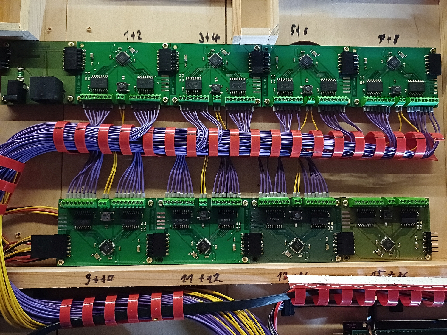 Die acht Switch Monitor Module sehen für mich alle gleich aus (siehe Bild 2). Auch die Beschriftung auf den Chips scheint gleich, ich bin aber kein Fachmann. Zur Verkabelung: An jedem Ausgang der Switch Monitor Module sind zwei LEDs angeschlossen. Eine am Tastenfeld neben dem Taster, eine im Gleisbild. Die Taster gehen an die Switch Man Module.